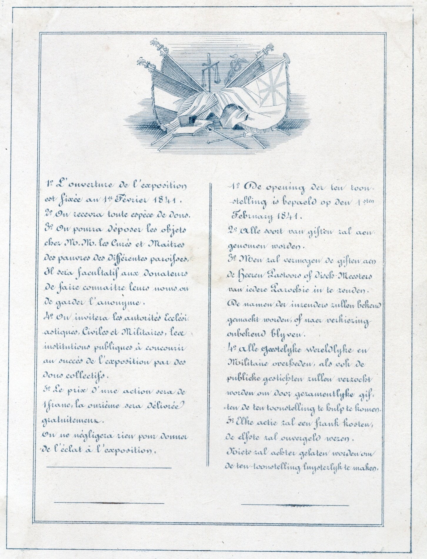 Centraal op de kaart staat de tekst "Exposition et loterie d'objets d'art au Profit des Pauvres de la Ville de Bruges; sous le patronage de la Commission de Bienfaisance. 1841."