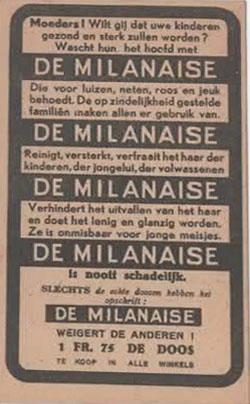 Een speelse manier om te verwijzen naar de aanwezigheid van luizen of neten, die De Milanaise doeltreffend bestrijdt. De “smokkelwaar” is dus letterlijk ongewenst krioelend leven. Gedrukt op dik papier. Formaat: ca. 6 x 10,3 cm. Goed bewaard en geliefd bij verzamelaars van nostalgische verzorgingsreclame met humor.