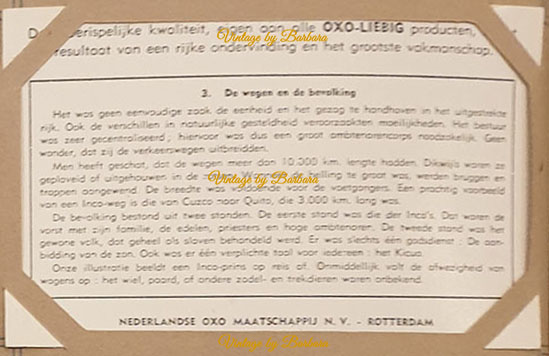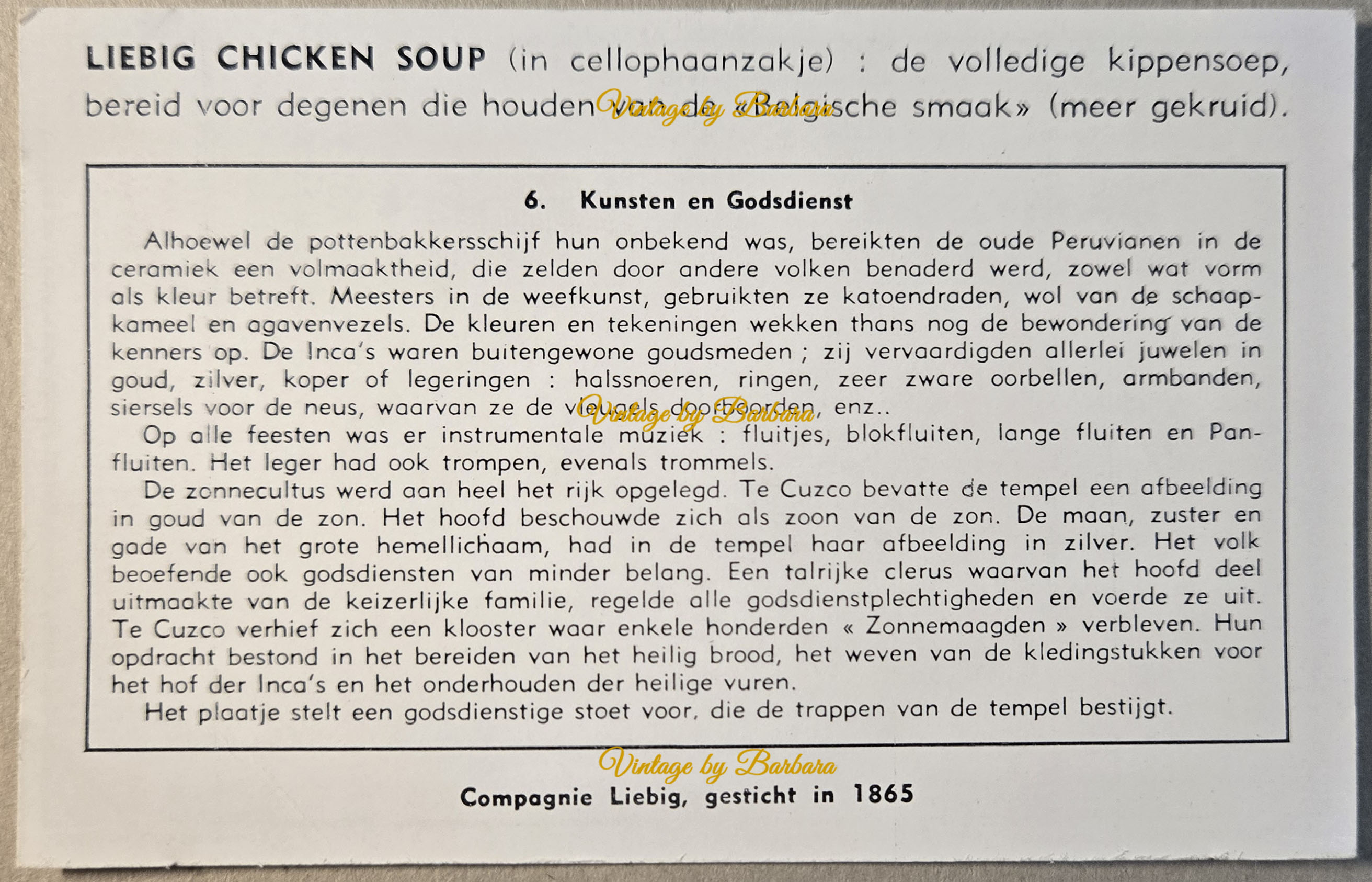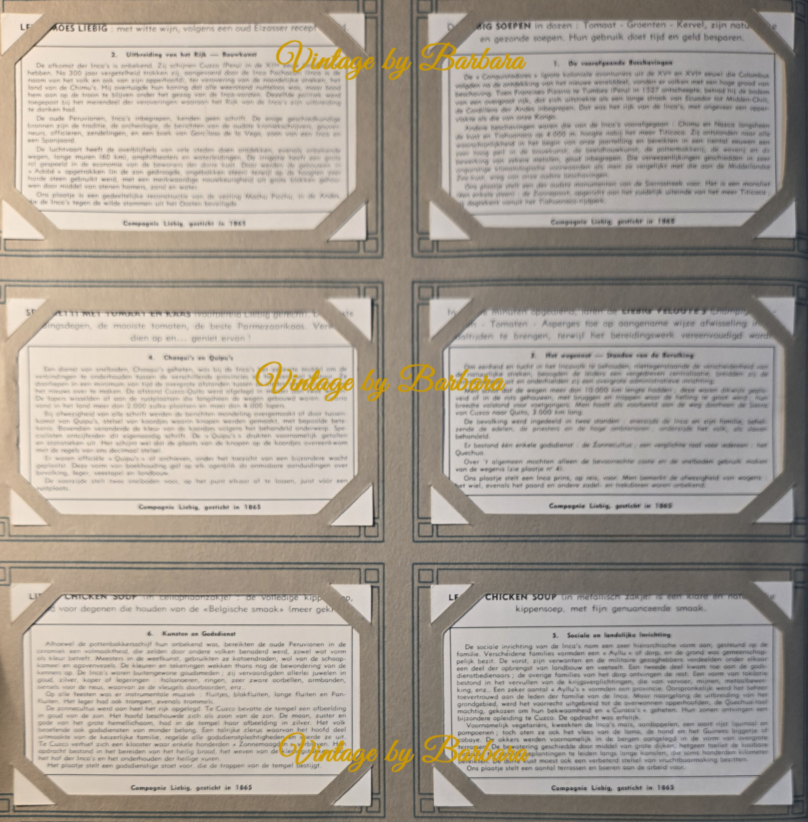 Liebig chromo reeks – Sanguinetti nr. 1591 – uit 1954, met zes illustraties over het rijk van de Inca’s.